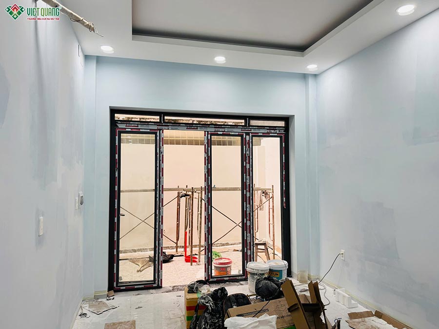 Sau khi hoàn tất phần thô, công trình nhà phố 3 tầng 4x12m chính thức bước vào giai đoạn hoàn thiện nhà đã xây thô – giai đoạn được gia chủ mong chờ nhất, khi từng đường nét kiến trúc bắt đầu hiện hữu rõ ràng. Đội ngũ nhân công Việt Quang Group triển khai các hạng mục hoàn thiện một cách đồng bộ, tỉ mỉ và đúng quy trình, bao gồm: tô tường, sơn nước trong và ngoài nhà; lát gạch nền, ốp tường các khu vực chức năng; thi công hệ cửa nhôm Xingfa; lắp đặt hoàn chỉnh hệ thống điện nước âm tường.