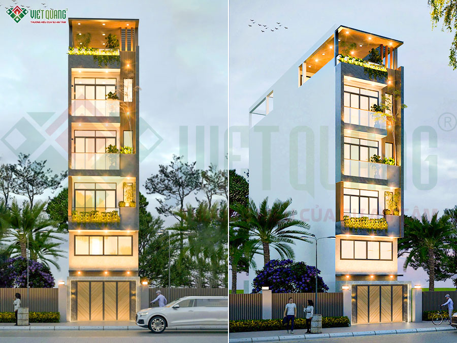 Thiết kế mặt tiền ngôi nhà phố 5 tầng mang đậm phong cách tối giản nhưng tinh tế, tạo nên sự sang trọng và cuốn hút ngay từ ánh mắt đầu tiên. Các mảng khối được bố trí vuông vức, kết hợp gam màu xám ghi chủ đạo cùng hệ thống cửa kính lớn, giúp tối ưu ánh sáng tự nhiên và mở rộng tầm nhìn. Điểm nhấn nổi bật là những khoảng xanh được bố trí xen kẽ ở từng tầng, từ ban công đến sân thượng, mang lại không gian sống thoáng đãng và gần gũi với thiên nhiên. Hệ thống đèn chiếu sáng ấm áp được lắp đặt khéo léo, làm tôn lên vẻ đẹp kiến trúc vào ban đêm. Phối cảnh mặt tiền này, khi được đội ngũ GĐK Việt Quang Group gửi cho gia đình anh Thành đã nhận được sự đồng ý ngay lập tức từ anh và gia đình.