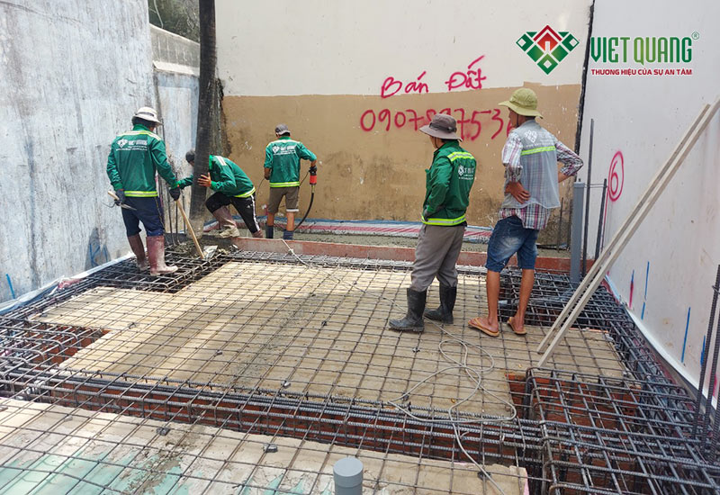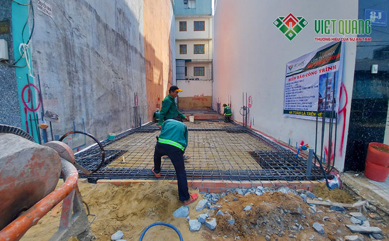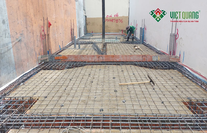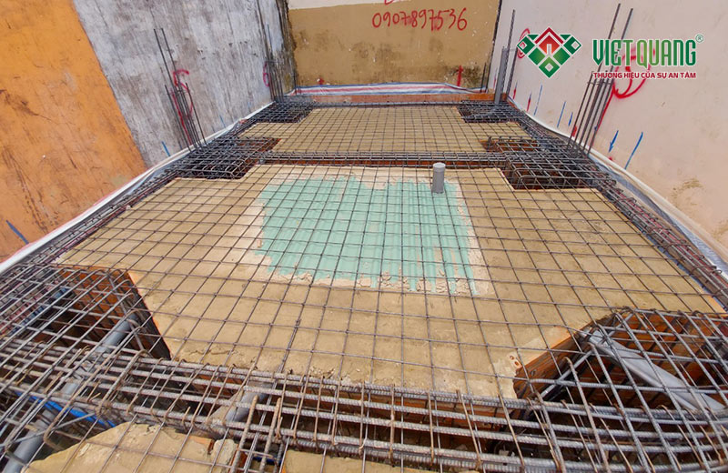 Hình ảnh thép móng và thép sàn trệt được bố trí, lắp đặt thẳng hàng rất đẹp mắt và thẩm mỹ do Việt Quang Group thi công