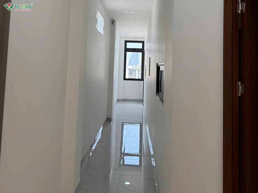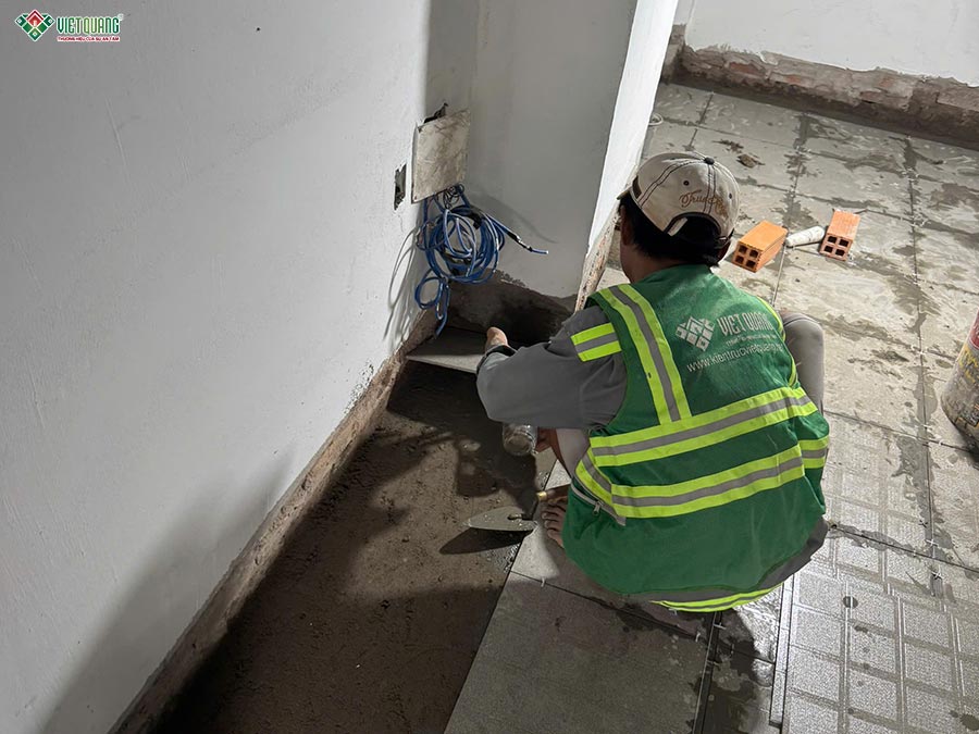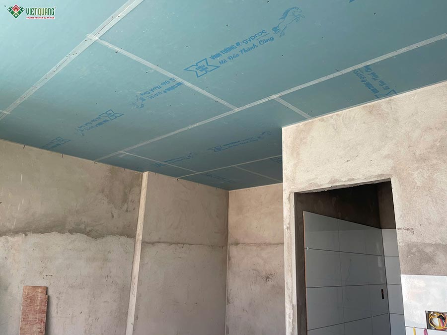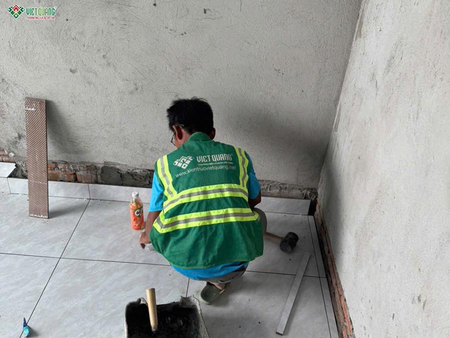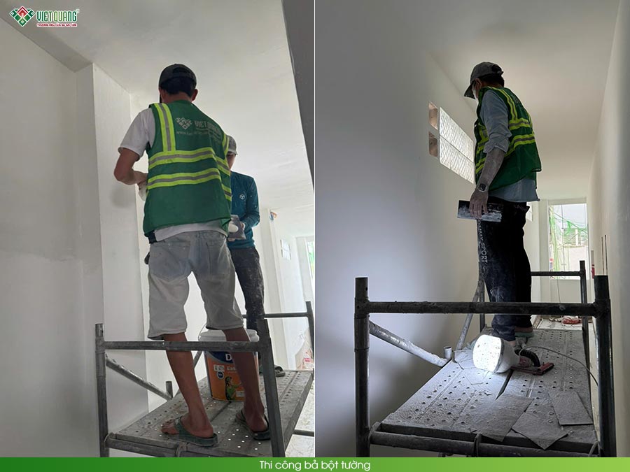 Sau khi hoàn tất phần xây thô, công trình nhà 1 trệt 1 lửng 3 lầu sân thượng 6x13m của gia đình anh Giang chính thức bước vào giai đoạn thi công hoàn thiện. Toàn bộ các hạng mục hoàn thiện như ốp lát gạch nền, ốp tường nhà vệ sinh, thi công trần thạch cao, bả bột và sơn nước được đội ngũ thợ tay nghề cao của Việt Quang Group thực hiện tỉ mỉ, cẩn trọng từng chi tiết. Bề mặt tường phẳng mịn, màu sơn đồng đều, sắc nét, góp phần tôn lên vẻ đẹp hiện đại, sang trọng của tổng thể không gian.