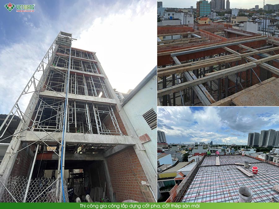 Quá trình thi công xây dựng phần thô nhà 1 trệt lửng 3 lầu sân thượng 6x13m gồm các công việc thi công cốp pha, cốt thép sàn, cột và cầu thang các tầng theo hồ sơ thiết kế kết cấu nhà ở, đảm bảo mang đến công trình chất lượng, bền vững theo thời gian. Kỹ sư xây dựng giàu kinh nghiệm của Việt Quang Group lập phương án thi công chi tiết gồm, loại vật liệu, vị trí thi công, kích thước đà kiềng, dầm sàn, cột trên bản thiết kế kết cầu nhà Anh Giang ngụ tại quận 7.