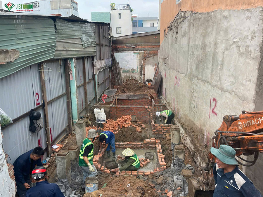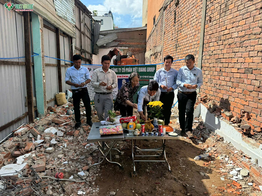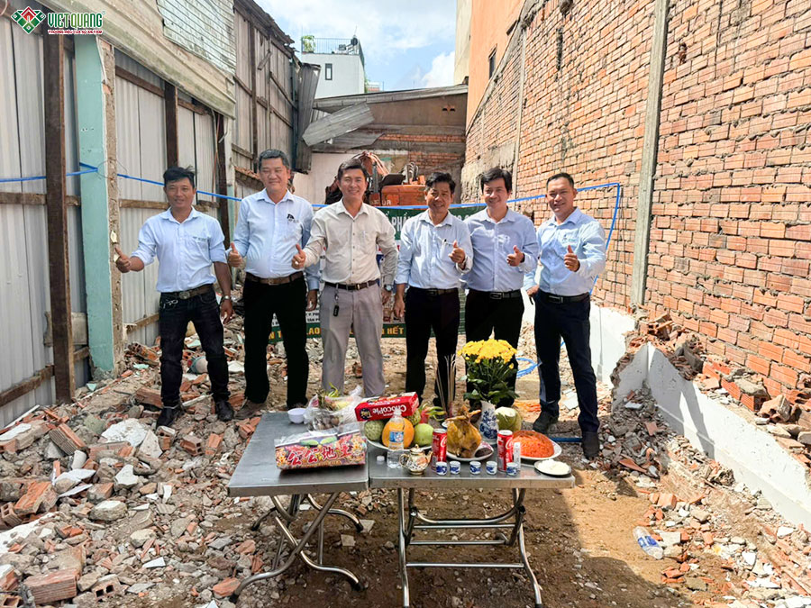 Ngày khởi công, đội ngũ Việt Quang Group đã tiến hành lễ động thổ và triển khai những bước đầu tiên trong quá trình thi công. Đây không chỉ là dấu mốc quan trọng khởi đầu cho công trình 7 tầng bề thế, mà còn là lời cam kết về sự uy tín, chất lượng và tiến độ đội ngũ Việt Quang Group mang đến cho gia đình cô Xuân.