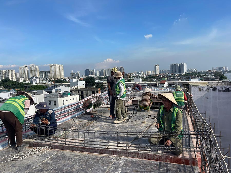 Dự án thi công xây dựng nhà 6 tầng cô Xuân ở Bình Thạnh tiếp tục thi công phần thô tạo khung nhà sau khi hoàn thành các hạng mục công việc ở phần móng. Giai đoạn thi công xây dựng phần thô từng tầng gồm các hạng mục: Thi công lắp dựng thép dầm đài sàn, đổ bê tông cột, xây tường bao tầng trệt, dọn dẹp vệ sinh và nghiệm thu kỹ thuật công tác triển khai đổ bê tông, bảo dưỡng bê tông. Tất cả đều được triển khai theo đúng hồ sơ thiết kế kết cấu, bản vẽ thi công và quy chuẩn kỹ thuật.