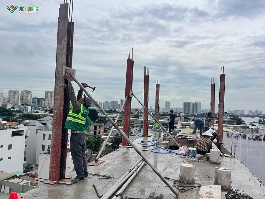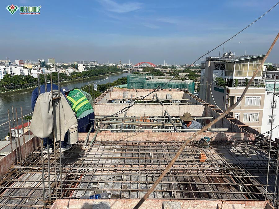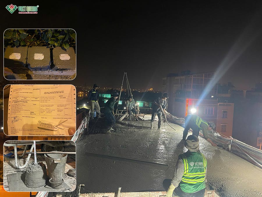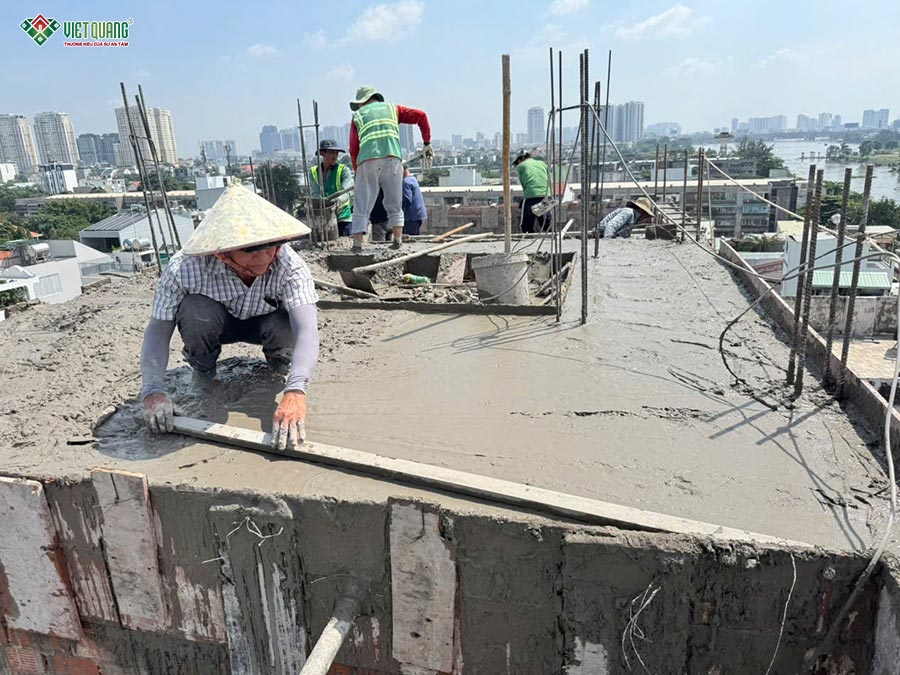 Đội ngũ thợ lành nghề của Việt Quang Group làm việc cẩn trọng, chính xác trong từng công đoạn. Trước mỗi lần đổ bê tông, kỹ sư phụ trách tiến hành kiểm tra kích thước, cốt thép, hệ thống coppha và các chi tiết kỹ thuật để đảm bảo không có bất kỳ sai sót nào. Sau khi bê tông được đổ, công tác bảo dưỡng bê tông được thực hiện đúng quy trình nhằm đảm bảo độ bền, độ ninh kết và khả năng chịu lực tối ưu.