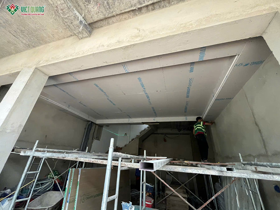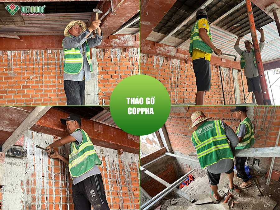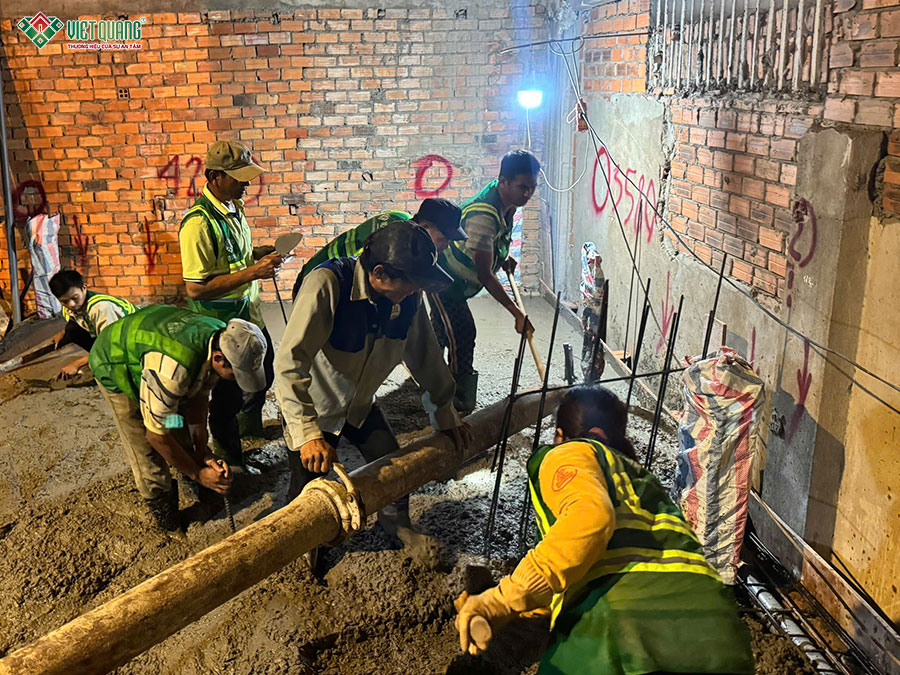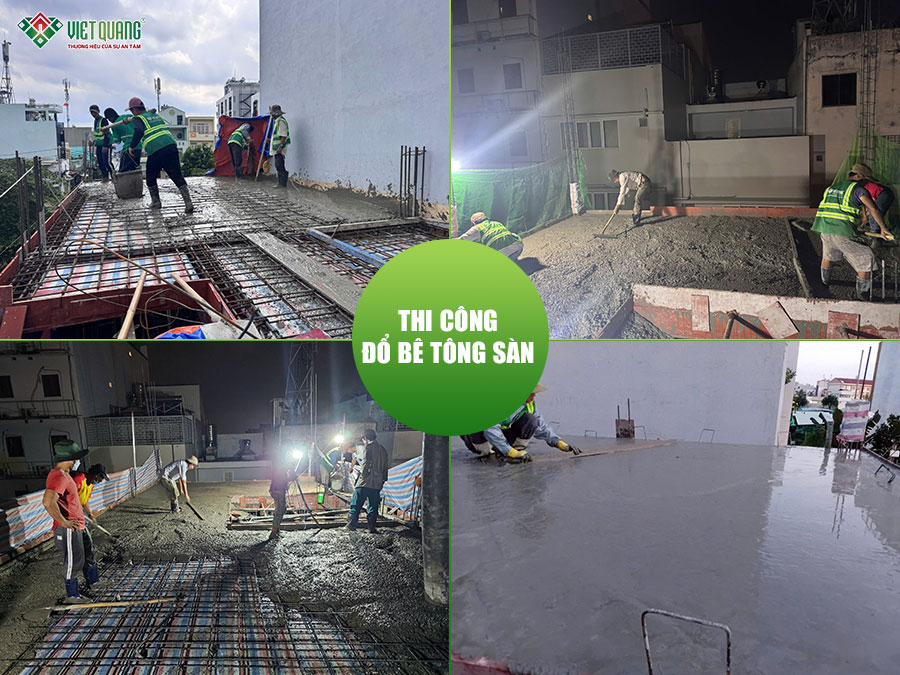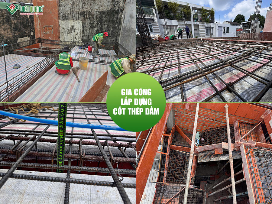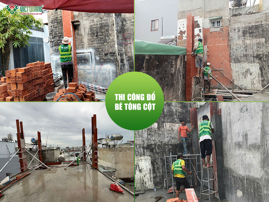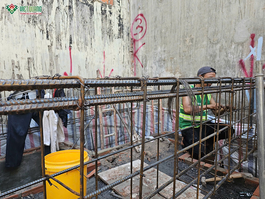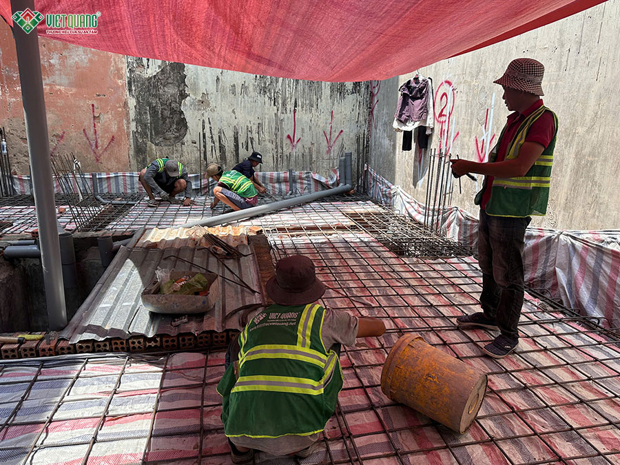 Trong giai đoạn này đội ngũ nhân công xây dựng Việt Quang Group tiến hành thi công cột, dầm, sàn, tường bao, cầu thang,… Tất cả đều được thực hiện theo đúng bản vẽ và tiêu chuẩn kỹ thuật đảm bảo độ chính xác, an toàn và bền vững cho công trình sau này.