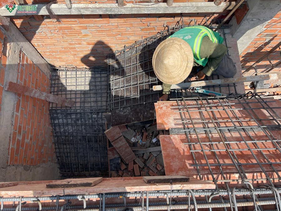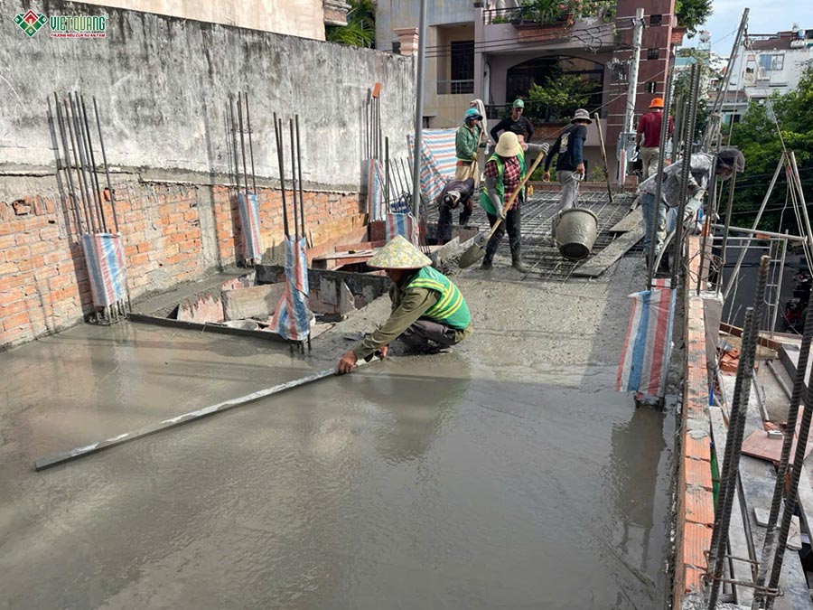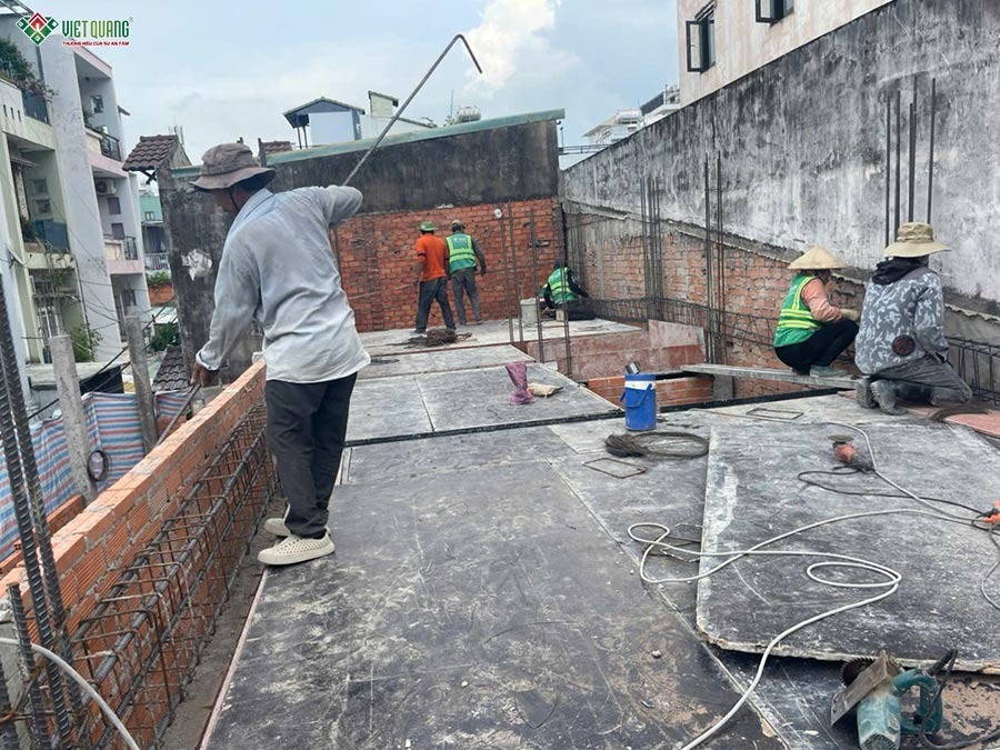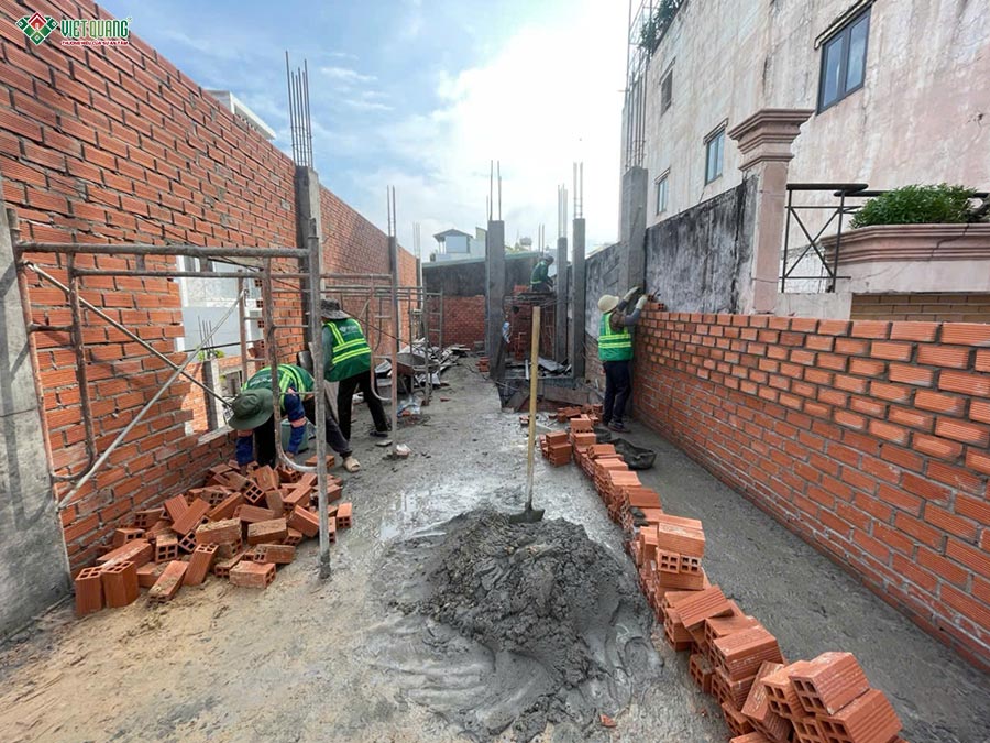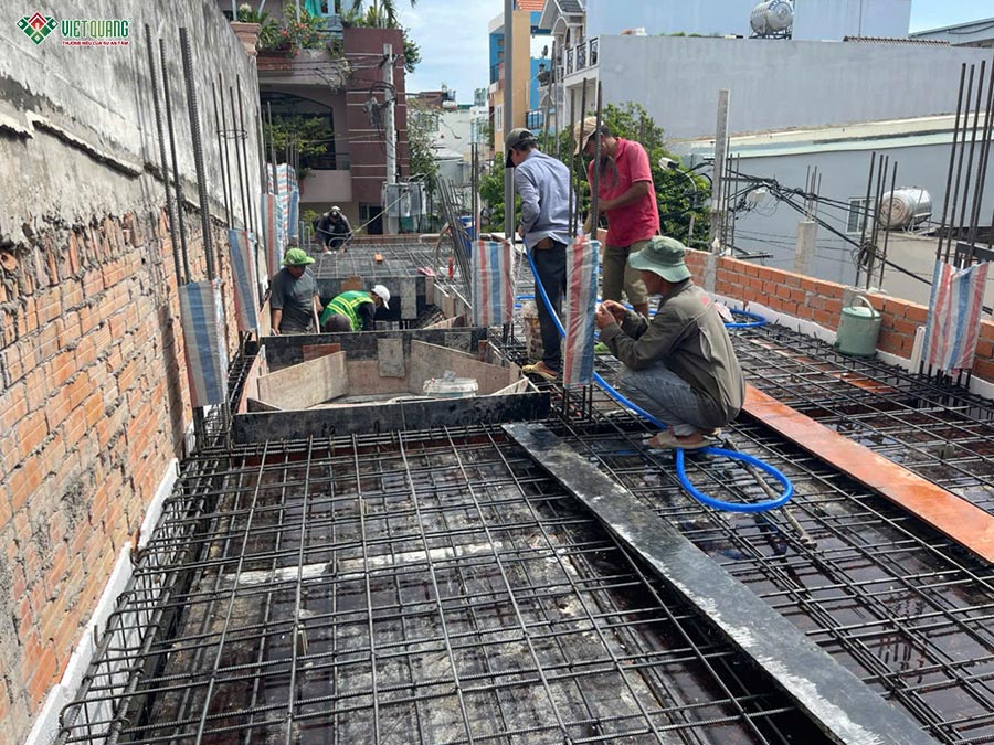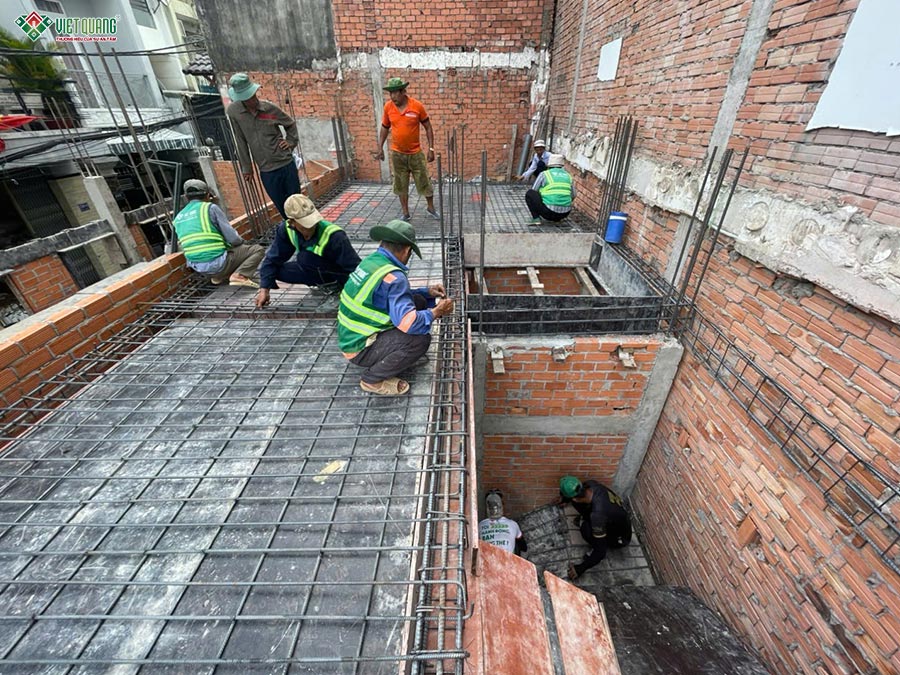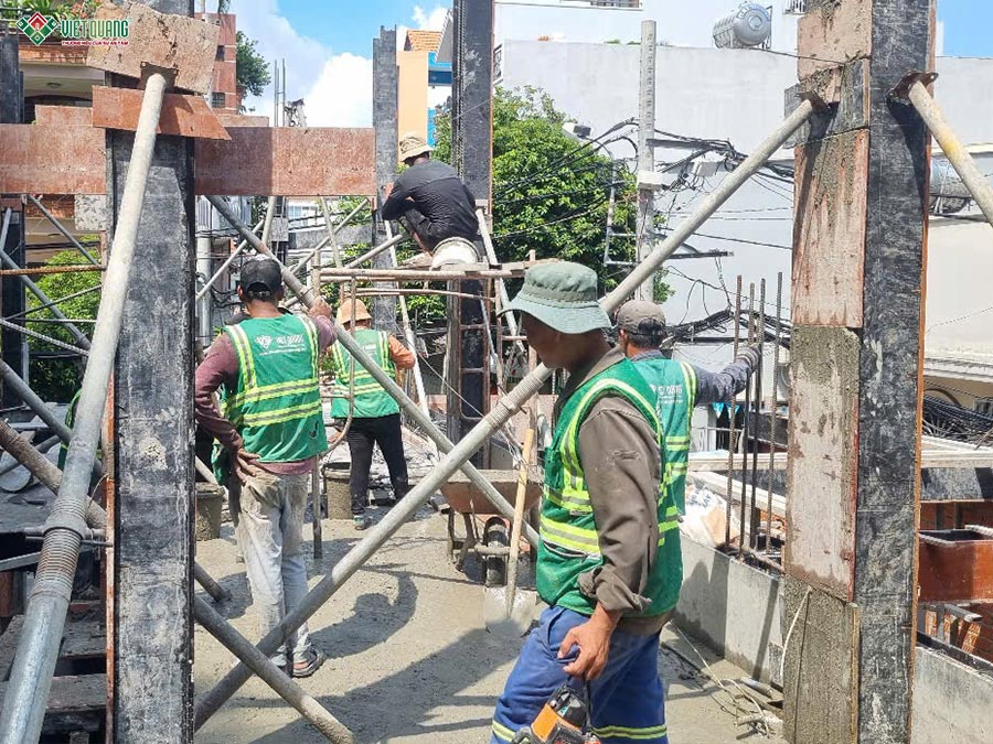 Quá trình thi công xây dựng phần thô được tổ chức theo từng tầng, giúp kiểm soát tốt chất lượng thi công, tiến độ và an toàn lao động. Toàn bộ vật tư sử dụng như thép, xi măng, bê tông đều đạt tiêu chuẩn, được kiểm tra kỹ lưỡng trước khi đưa vào thi công. Ở giai đoạn này, bạn cần lưu ý thi công chống thấm sân thượng, nhà vệ sinh, cổ ống thống sàn,… Và chống nứt cho các khu vực tiếp giáp tường gạch với bê tông,…đảm bảo công trình đạt độ bền vững cao, tạo nền tảng quan trọng cho các giai đoạn hoàn thiện tiếp theo. Xuyên suốt quá trình, đội ngũ kỹ sư, giám sát hiện trường Việt Quang Group thường xuyên theo dõi, nghiệm thu từng hạng mục nhằm đảm bảo chất lượng công trình.